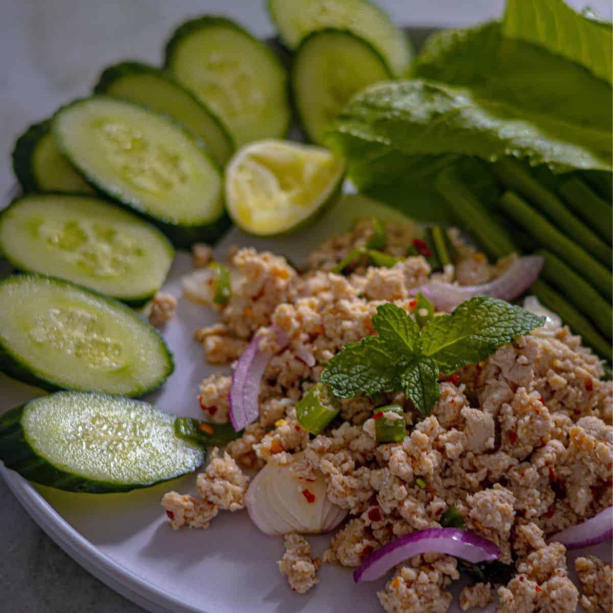 Laab Gai (Thai minced chicken salad) is a quick, flavorful, and healthy weeknight dinner. This authentic Thai -Lao dish combines tangy lime juice, savory fish sauce, and fresh herbs for maximum flavor. Serve it with sticky rice, lettuce wraps, or even tortillas for a fun twist.